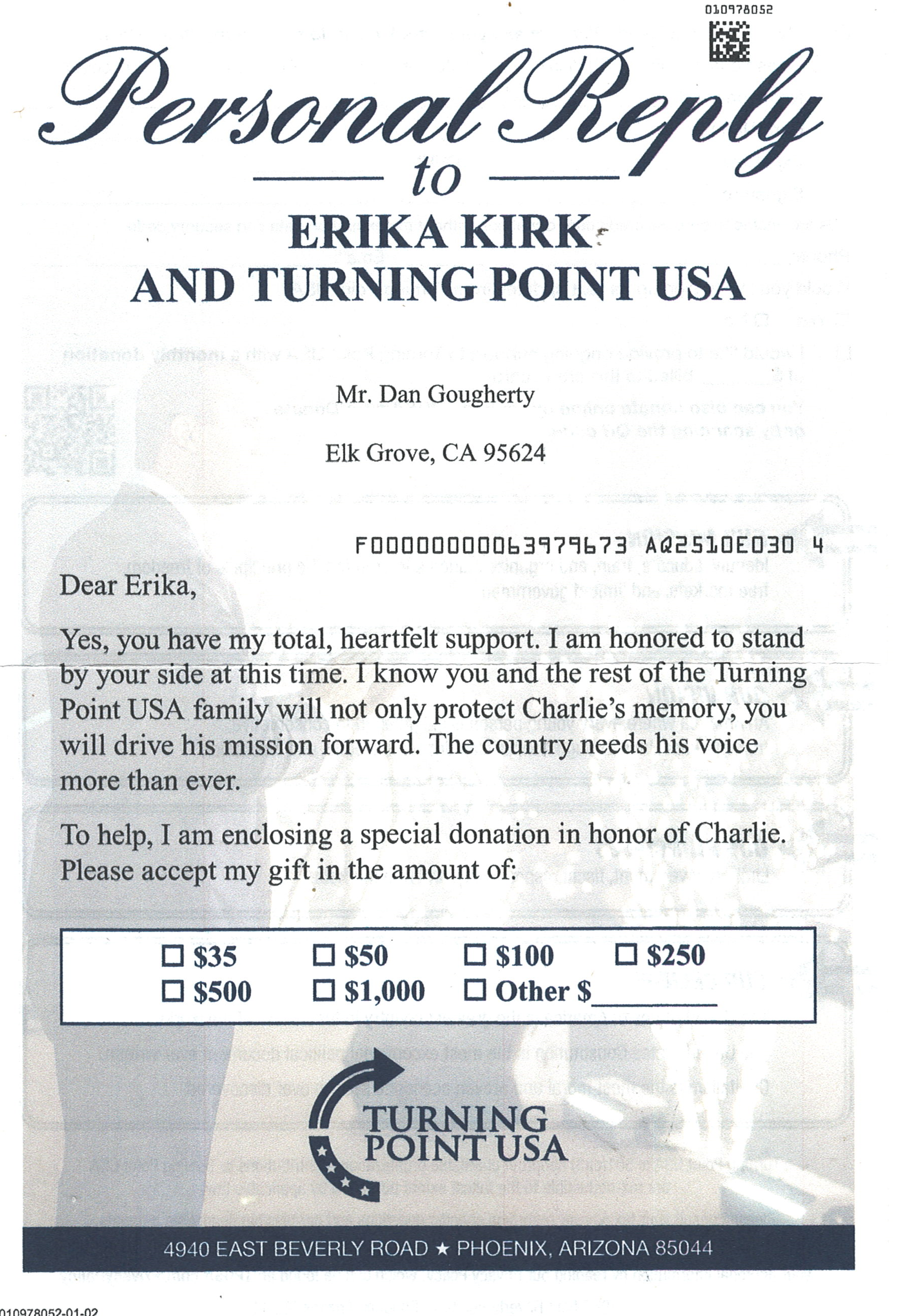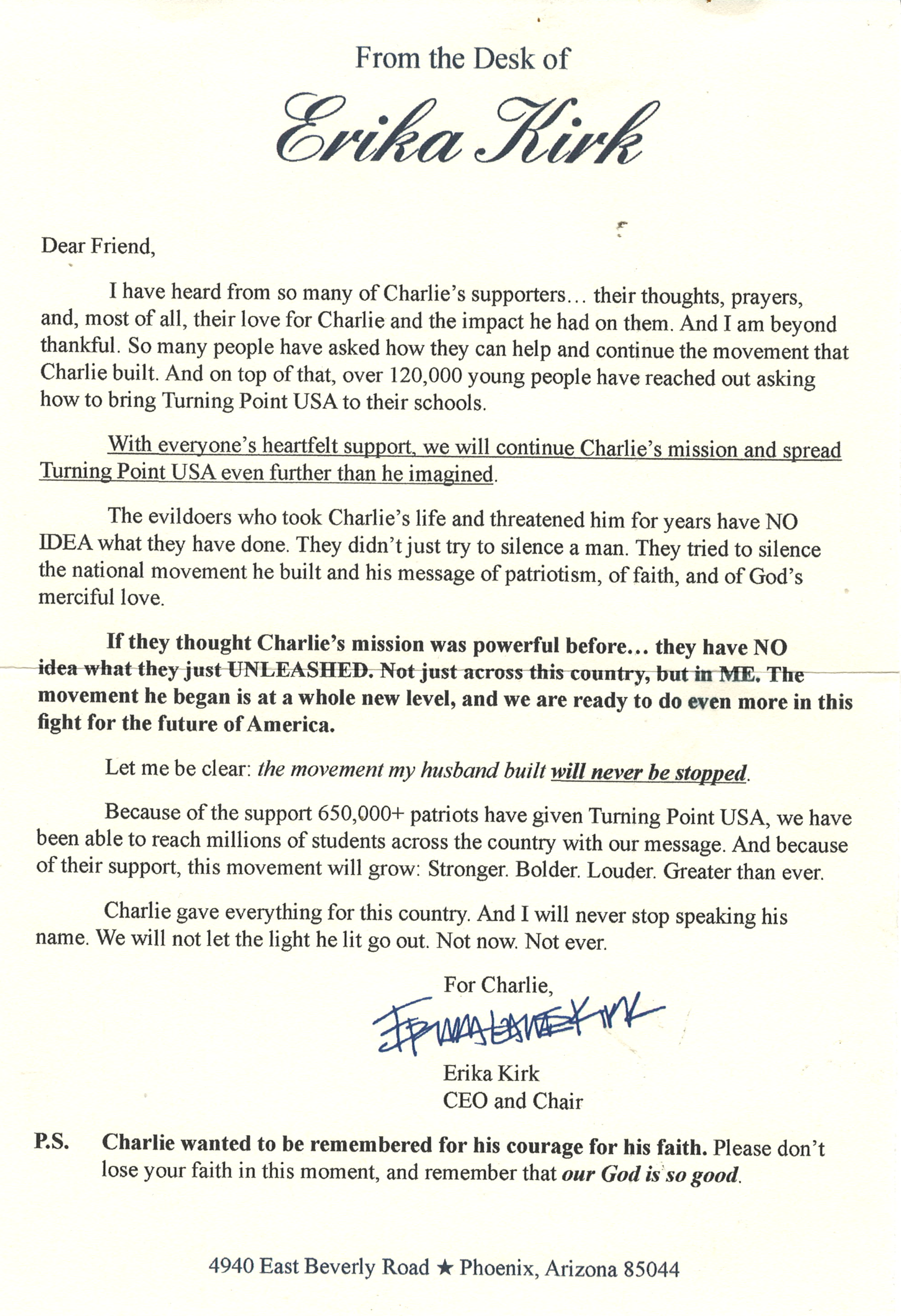Yesterday's fundraising letter, which arrived in my mailbox, was unlike anything I have ever received. It was from Erika Kirk, the widow of the recently murdered Charlie Kirk, the controversial founder of Turning Point USA.