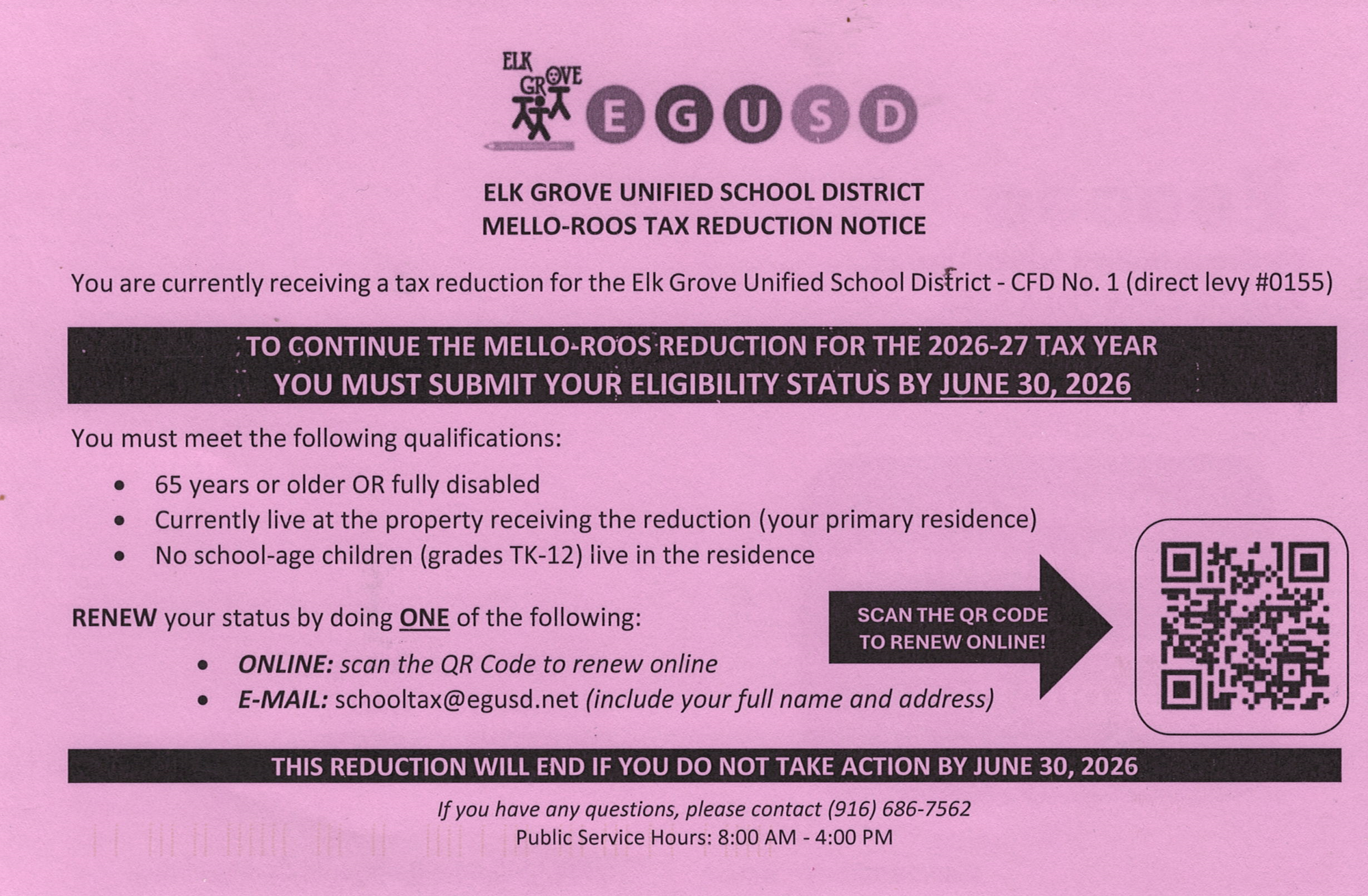 Seniors who own property within the boundaries of the Elk Grove Unified School District can have a reduction in their fees. See the images below for the requirements and procedure for securing the reductions.