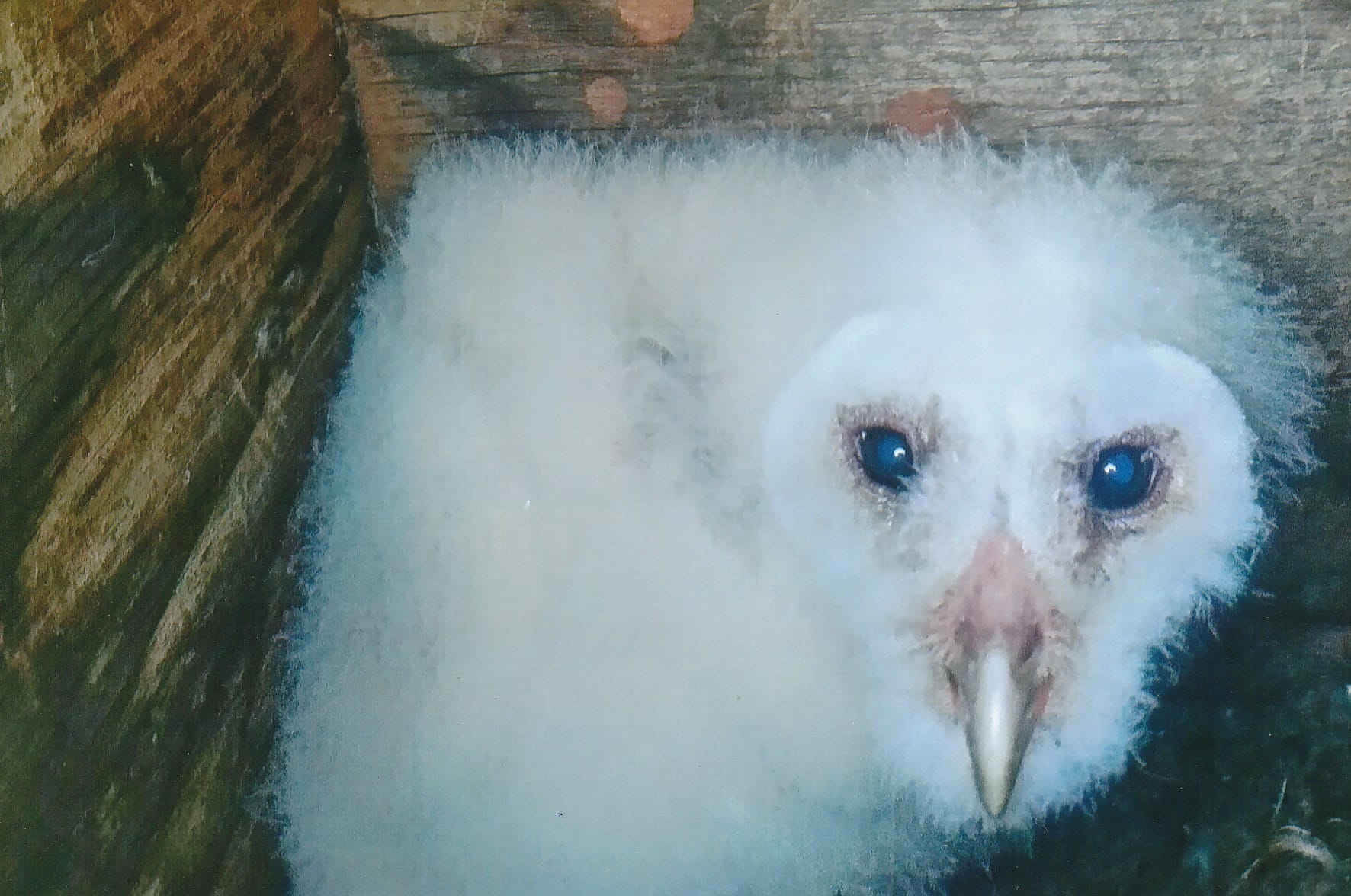 I became obsessed with spying on the owl box. However, after a few weeks, I no longer saw the face in the opening and began to worry. I convinced my husband to get the tall ladder so I could peek inside. I was startled a bit at the sight of a single owlet, looking up at me with a so otherworldly face!