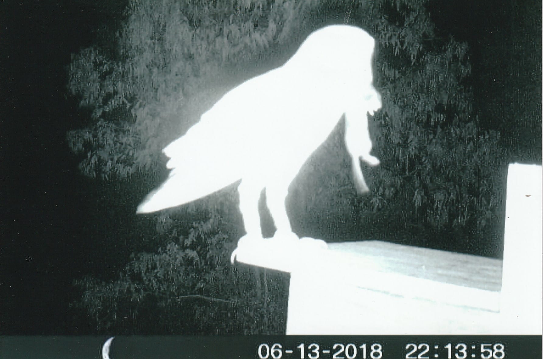 Moments after reattaching the nesting box to the tree the mother owl did a fly-by. I wondered how many of those she did while we were gone. The purchase of a wildlife camera set my mind at ease. So many pictures of the parents bringing Voles to the waiting in the box “Sheldon” night after night. Eventually he fledged as a beautiful barn owl, now in the nearby trees, but still calling out loudly in the dark for more owl food.