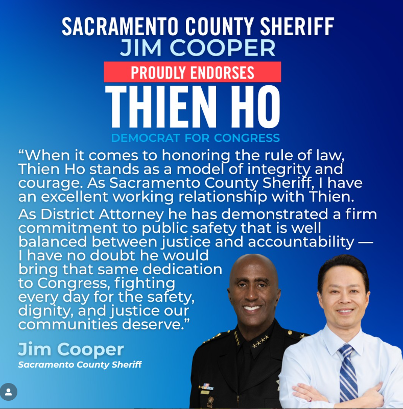 Sacramento County District Attorney Thien Ho, a Democrat, announced Monday he has received the endorsement of Sacramento County Sheriff Jim Cooper in the race for California's newly drawn 6th Congressional District.