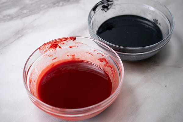 3. In separate small bowls, add black melting chips and red melting chips.