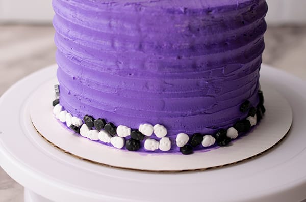 7. In small bowl, mix two parts purple food coloring to one part black food coloring. Ice cake with deep purple icing. Using grooved scraper, scrape along sides of cake. Using angled spatula, smooth top of cake.
