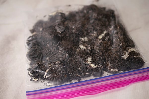 2. In zip-top bag, using rolling pin, crush chocolate creme cookies; set aside.